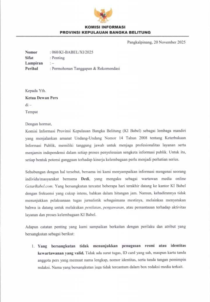 TROPEDO.ID — Komisi Informasi Provinsi Kepulauan Bangka Belitung (KI Babel) akhirnya mengambil langkah resmi dengan melayangkan surat kepada Dewan Pers terkait keberadaan seorang individu bernama Dedi, yang mengaku sebagai wartawan media online GetarBabel.com. Jum’at (21/11/2025).