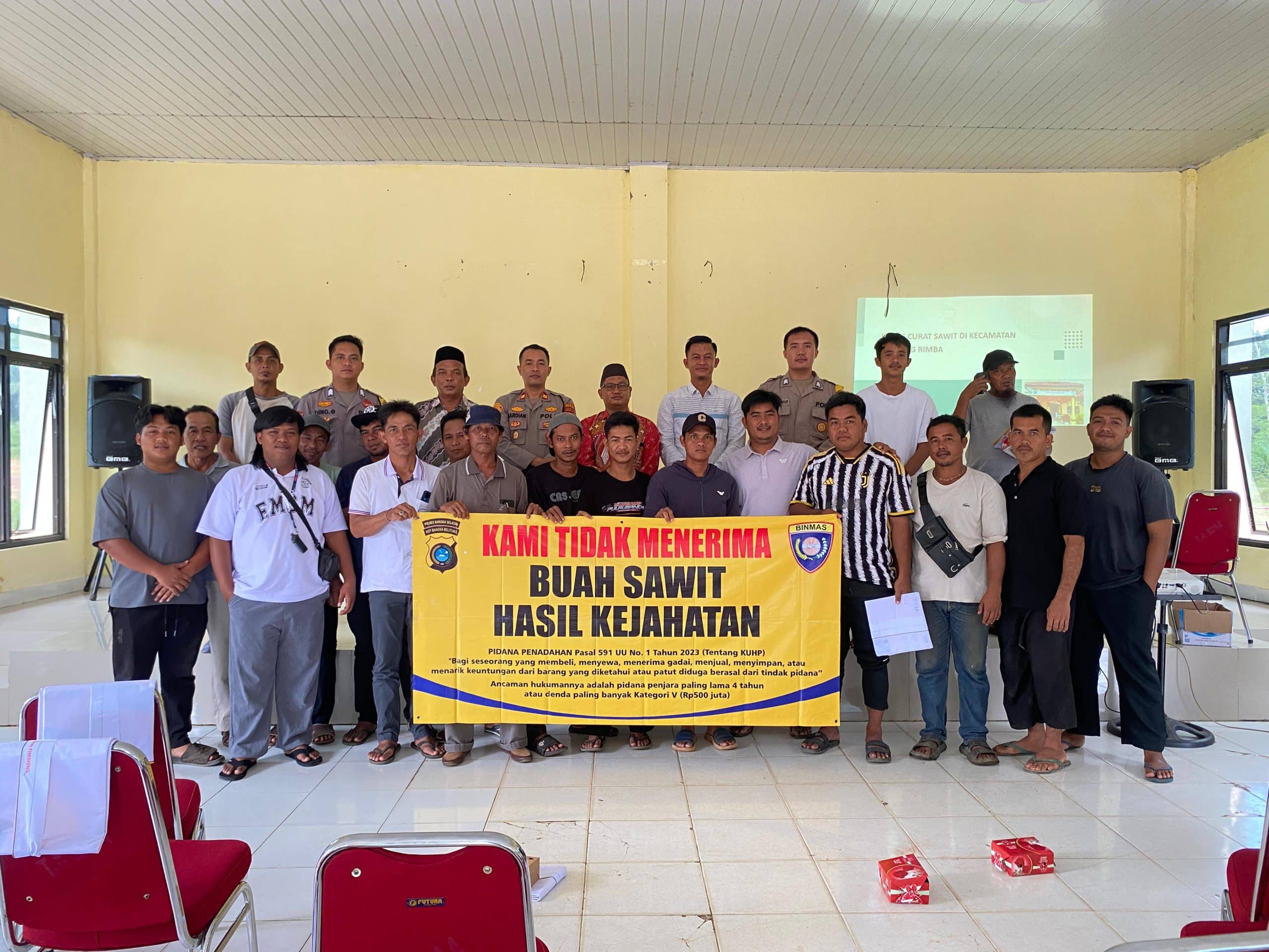 TROPEDO.ID — Upaya pencegahan tindak pidana pencurian buah kelapa sawit terus dilakukan jajaran Kepolisian. Kali ini, Polsek Simpang Rimba menggelar sosialisasi hukum terkait pencurian dan pembelian barang yang diduga hasil kejahatan sebagaimana diatur dalam KUHP baru, kepada para penampung dan pembeli Tandan Buah Segar (TBS) kelapa sawit di wilayah Kecamatan Simpang Rimba, Kabupaten Bangka Selatan.